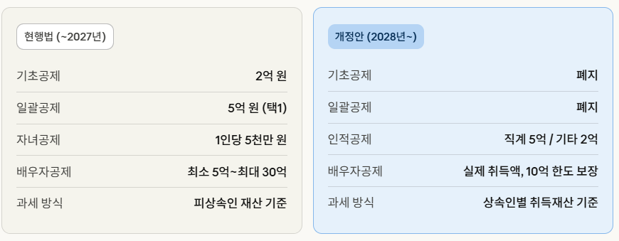 현행법은 일괄공제 5억 원이 기준이고, 2028년 개정안은 직계가족 기준 최소 10억 원 보장으로 바뀝니다.