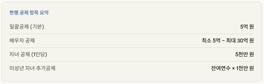 배우자 유무, 자녀 수, 시행 시점 — 이 세 가지가 상속세 면제한도를 결정하는 핵심 변수입니다.
