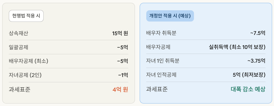 개정안 하에서는 상속인별로 개별 계산하는 구조이므로, 아파트 상속세 부담이 현행보다 낮아지는 경우가 많을 것으로 예상됩니다. 특히 배우자 공제 최저 보장액이 5억에서 10억으로 확대되는 점이 큽니다.